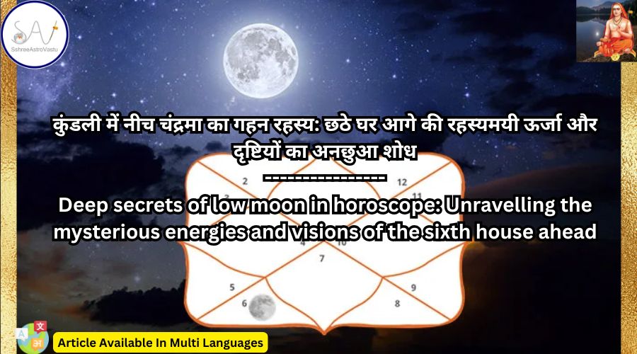 नीच चंद्रमा जिस भाव में हो, वहां से छठे घर आगे का रहस्य एक अनछुआ पहलू है: यह “षष्ठ आगे” जीवन के छिपे संघर्षों को दर्शाता है, जहां चंद्रमा की ऊर्जा शत्रु, रोग और कर्ज के माध्यम से परीक्षा लेती है। उदाहरण के लिए, यदि नीच चंद्रमा प्रथम भाव में हो (वृश्चिक लग्न), तो छठे आगे अर्थात सप्तम भाव (विवाह) में रहस्य छिपा है – जहां भावनात्मक असुरक्षा वैवाहिक जीवन को गुप्तकलह से भर देती है।