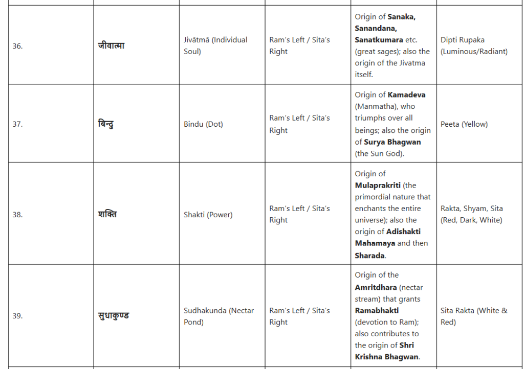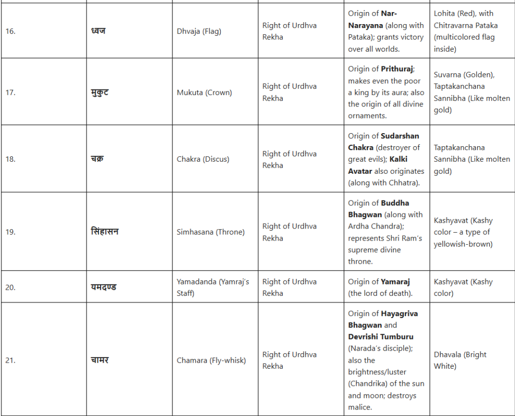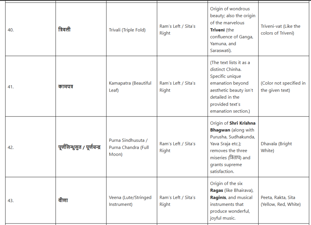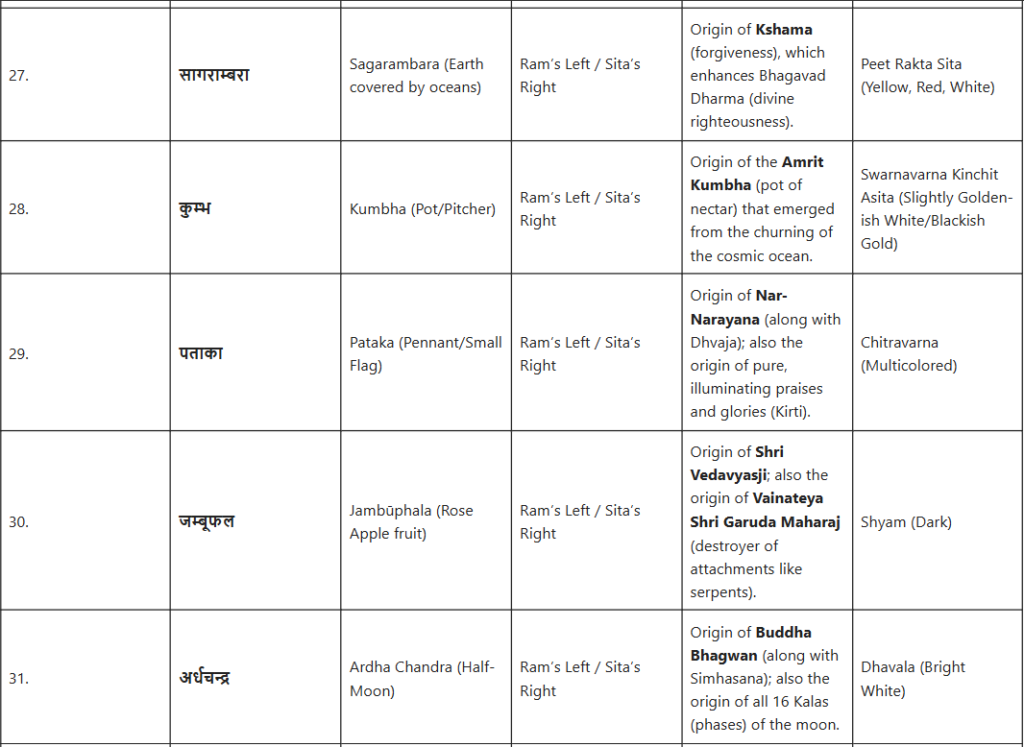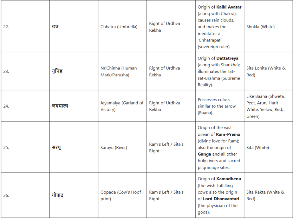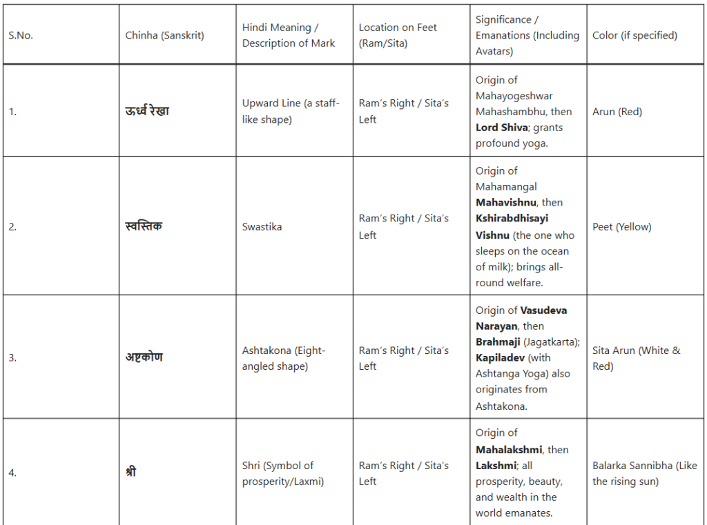 जैसा कि महारामायण में, विशेष रूप से गिरिजा-महेश्वर संवाद (भगवान शिव और माता पार्वती के पवित्र संवाद) में वर्णित है, इन चिह्नों का अत्यंत सूक्ष्म वर्णन किया गया है। यह गूढ़ ज्ञान, जिसे महर्षि वशिष्ठ स्वयं योग वशिष्ठ में श्रीराम को बताते हैं, इस तथ्य को उजागर करता है कि सभी दिव्य अवतार और सिद्धांत उनके परम स्वरूप से ही उत्पन्न होते हैं।